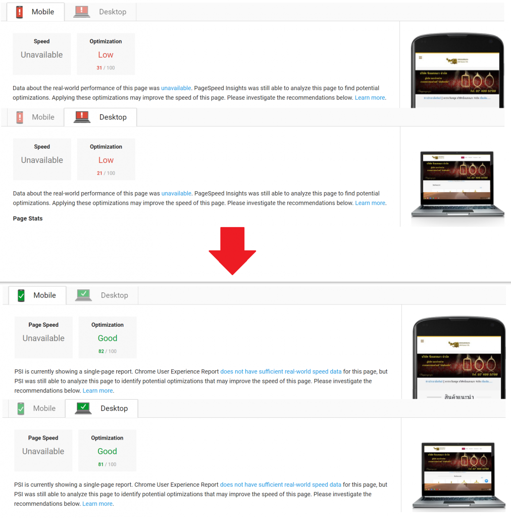 นอกจากเรื่องเนื้อหาแล้ว การใช้งานเว็บไซต์จะต้องให้ผู้ใช้ ใช้งานได้ลื่นไหล โหลดเร็ว โดยในส่วนนี้เราใช้ https://developers.google.com/speed/pagespeed/insights/ เป็นตัวชี้วัดตามมาตรฐาน Google ซึ่งสามารถปรับแต่งเว็บไซต์ได้โดยการย่อ Code หลักๆ คือ HTML, CSS และ Javascript นอกจากนี้ สิ่งที่จะทำให้เว็บเร็วขึ้นคือการปรับแต่งขนาดรูปภาพให้พอดีไม่ใหญ่เกินไป